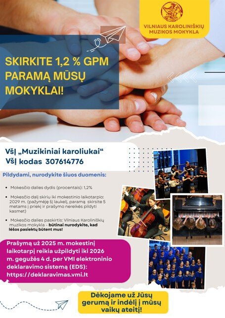 - Mokesčio dalies paskirtis: Vilniaus Karoliniškių muzikos mokykla - būtinai nurodykite, kad lėšos pasiektų būtent mus!