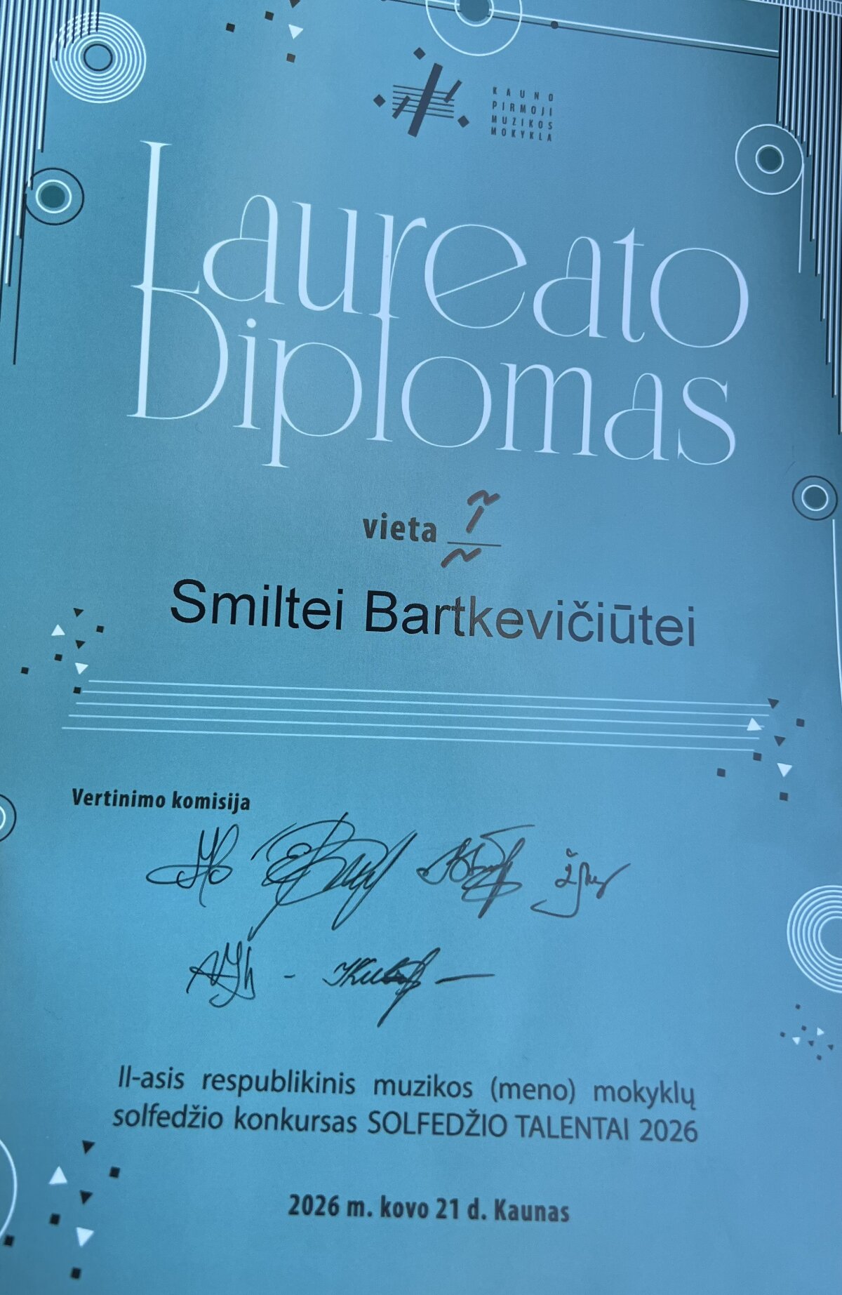 Sveikiname solfedžio dalyko mokinę Smiltę Bartkevičiūtę, laimėjusią laureato vardą ir I vietą 2026 m. kovo 21 d. Kauno 1-ojoje muzikos mokykloje vykusiame II respublikiniame muzikos ir meno mokyklų solfedžio konkurse „Solfedžio talentai 2026“.