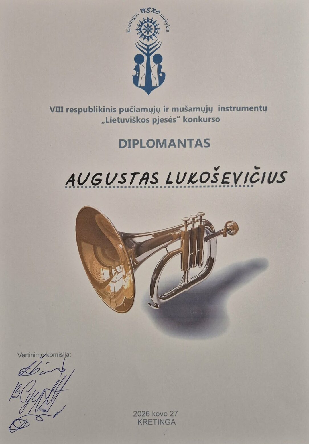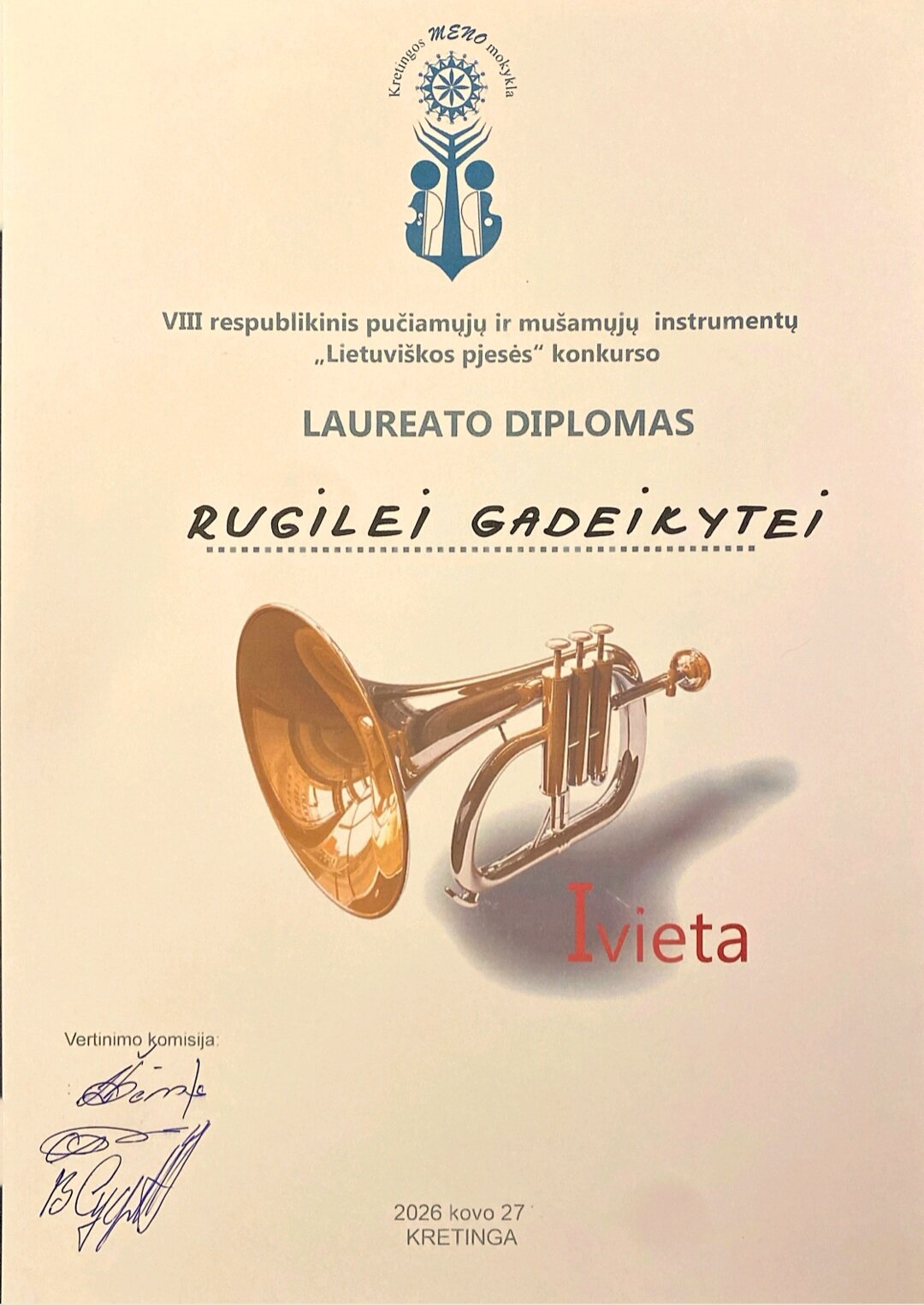 Sveikiname VIII respublikinio pučiamųjų ir mušamųjų instrumentų „Lietuviškos pjesės“ konkurso, vykusio 2026-03-27 Kretingos meno mokykloje,