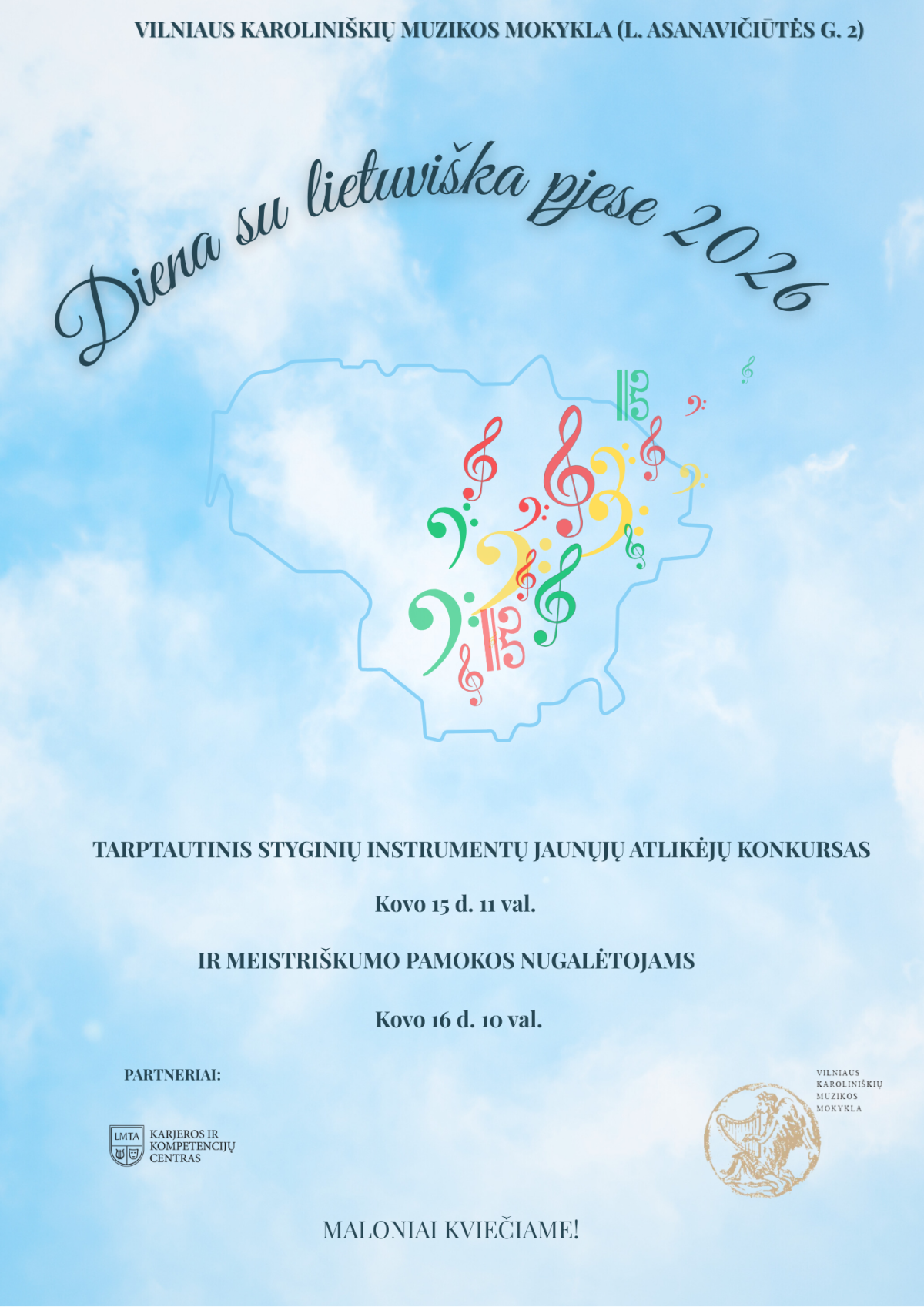 Vilniaus Karoliniškių muzikos mokykloje rengiamas tarptautinis styginių instrumentų jaunųjų atlikėjų konkursas ir seminaras ,,Diena su lietuviška pjese 2026“.