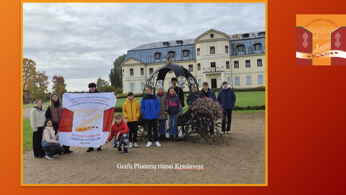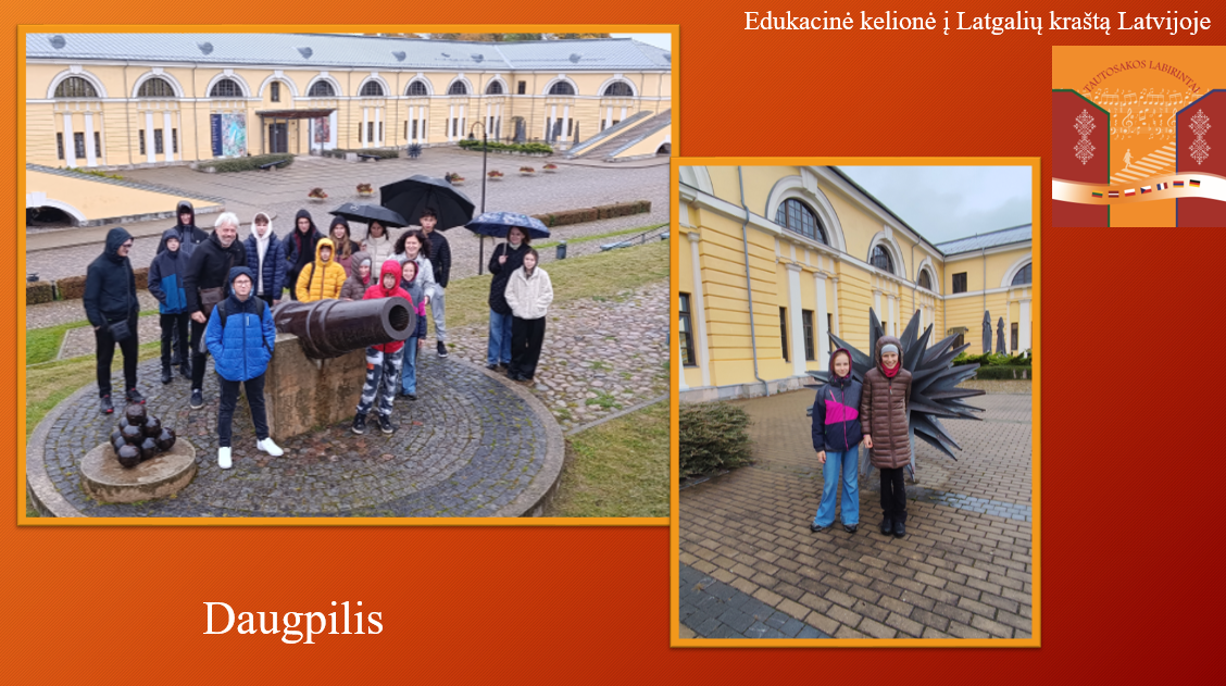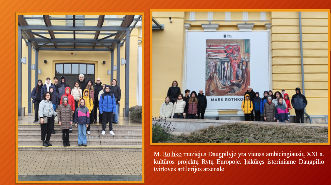 2025 m. spalio 10 dienos ankstyvą rytą tarptautinio projekto ,,Tautosakos labirintai“ 13 dalyvių komanda (mokytojai Raimonds Ungurs, Klara ir Kornelijus Karnaševičiai, Vilniaus lopšelio-darželio muzikos mokytoja Jūratė Mackevičienė) iškeliavo į spalvingą dviejų dienų edukacinę kelionę po Latgalių kraštą (Latvija). Nors buvo lietingas rytas, tačiau po 3 valandų kelionės dalyviai, puikiai nusiteikę, jau grožėjosi Daugpilio senamiesčiu ir vyko į Marko Rothko muziejų. M. Rothko muziejus Daugpilyje yra vienas ambicingiausių XXI a. kultūros projektų Rytų Europoje, įsikūręs istoriniame Daugpilio tvirtovės artilerijos arsenale. Mokiniai susipažino su vienu žymiausių abstrakčiojo ekspresionizmo atstovo M. Rothko biografijos bei kūrybos etapais. M. Rothko buvo vienas iš pirmųjų spalvos lauko tapybos pradininkas. Kitose muziejaus salėse mokiniai susipažino su Latvijos tapytojų dailės ir keramikos darbais.