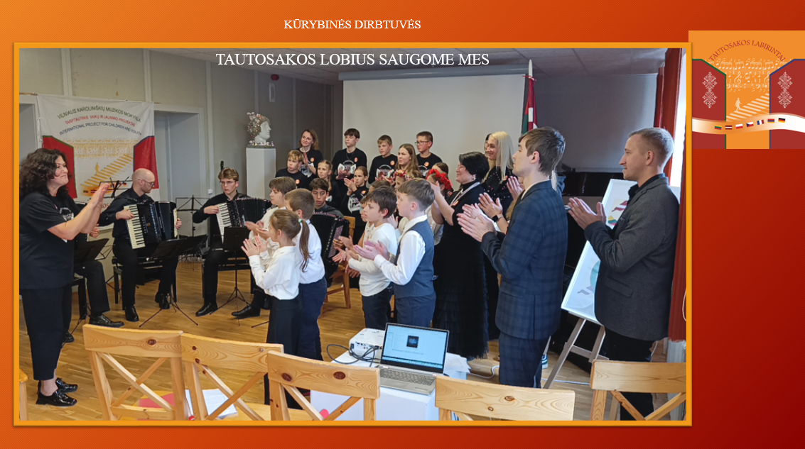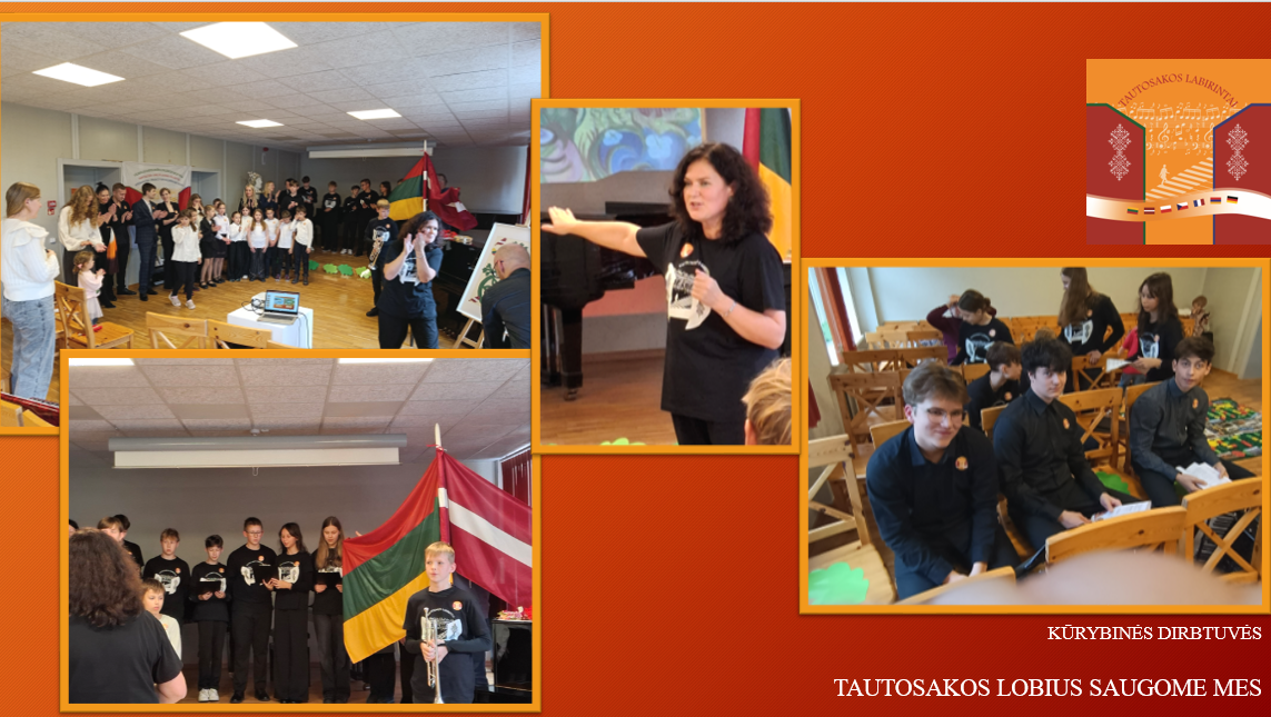 ,,Tautosakos lobius saugome MES“ – šiuolaikinė kūrybos erdvė Kraslavos muzikos ir dailės mokykloje. Projekto dalyviai atliko bendrą projekto meninę programą. Ritmavimo kompozicijų veiklos išmokė projekto dalyvius ne tik klausytis vieni kitų, bet ir kurti, išreikšti save, bendradarbiauti, ieškoti bendrumo tarp latvių ir lietuvių tautų, išgirsti kitą, suprasti per dainą, piešinį ar garsą. Labai ačiū už malonų renginį. Buvo tikrai malonu susitikti ir pažinti vieniems kitus. Sveikinimai visiems, o ypač Klarai, kurios begalinė energija išties žavi. Tikimės, kad dėka Jūsų ryšio tarp Kraslavos ir Vilniaus ateityje galėsime maloniai bendradarbiauti“.
