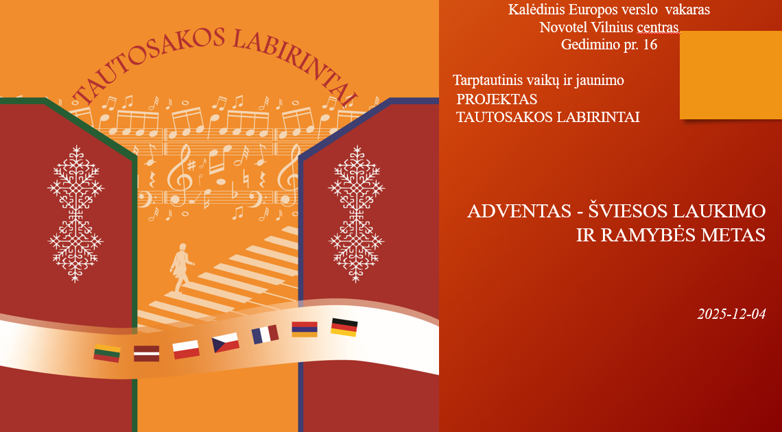 2025 m. gruodžio 4 d. tarptautinio vaikų ir jaunimo projekto ,,Tautosakos labirintai“ dalyviai – Vilniaus lopšelių-darželių ,,Boružėlė“, ,,Žolynas“ auklėtiniai ir mūsų mokyklos solfedžio dalyko 2–6 klasių mokiniai – dalyvavo kalėdiniame Europos verslo vakare. Projekto dalyviai pristatė meninę programą ,,Adventas – šviesos laukimo ir ramybės metas“, lietuvių tautosakos advento papročius ir tradicijas, atliko lietuvių liaudies advento dainas.