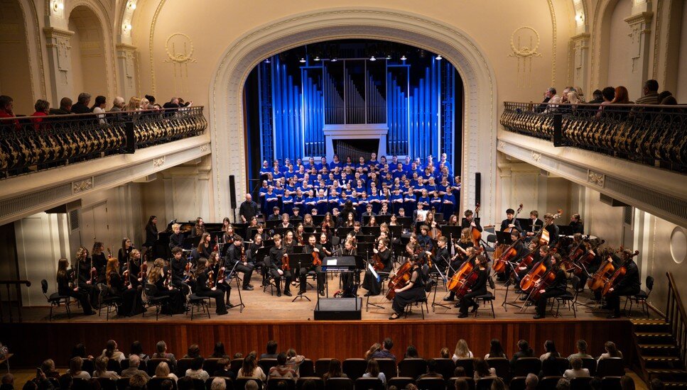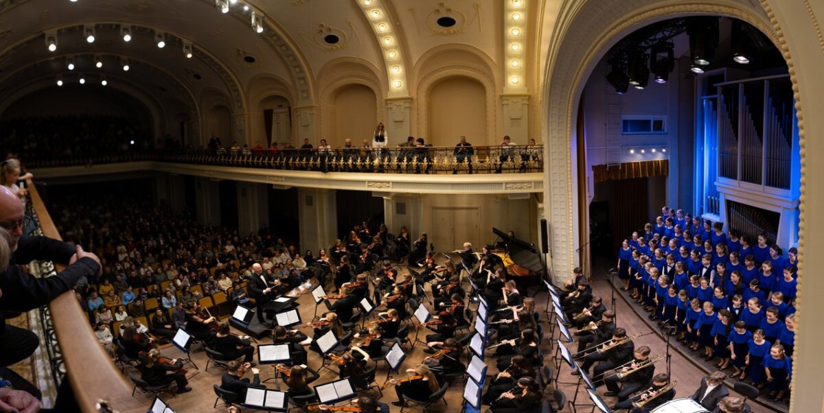 Nuskambėjęs Georges Bizet „Carmen“ preliudas priminė operos scenos kvapą, o Robert W. Smith „Into the Storm“ – šiuolaikišką dramatinį veržlumą. Vakaro kulminacija tapo bendrystė su choru. Vilniaus Karoliniškių muzikos mokyklos Jaunių choras „Cantica“ (vad. Gražina Gumuliauskienė, chormeisterė Sandra Bareikaitė, koncertmeisterė Aušra Kanišauskaitė) – tai ilgametis simfoninio orkestro scenos partneris ir draugas. Bene šimto vaikų kolektyvas yra ne tik choras, bet ir reiškinys. Lietuvių liaudies sutartinės „Tu avinėli“, „Lylio, lelijo“, „Išvedžiau ožį“ (aranž. Jonė Girdzijauskaitė–Pocienė) suskambo lyg priminimas, kad mūsų muzikinė tapatybė prasideda nuo balsų. Tuokart Laimio Vilkončiaus kūrinys „Dėl tos dainos“ (eil. Just. Marcinkevičiaus) chorui ir orkestrui tapo jubiliejaus širdies dūžiu. Ir, žinoma, bisas – Johanno Strausso polka „Medžioklėje“ išlydėjo publiką su šypsena.