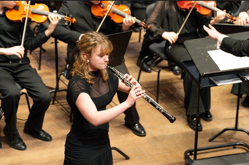 Vakaro solistai buvo tikras jubiliejaus perlas. Ne vien dėl technikos, o dėl brandos, su kuria jie scenoje kūrė ryšį. Obojininkė Dorotėja Kizerskytė, respublikinių ir tarptautinių konkursų laureatė, šiandien orkestre grojanti pirmuoju obojumi, atliko Ennio Morricone „La Califa“. Obojaus „balsas“ skambėjo it žmogaus pasakojimas – kartais trapus, kartais tvirtas, bet visada nuoširdus. Dorotėjos muzikalumas, subtilus kvėpavimas ir frazės vientisumas leido kūriniui skleistis natūraliai, be dirbtinio dramatizmo. Gražiai suskambėjo ir fortepijono partija. Pianistė Dovilė Kirlytė jautriai palaikė solistę, o mokytojų Viktor Palej ir Jurgos Reneckytės-Žemaitienės indėlis jautėsi kaip stipri, patikima atrama užkulisiuose.